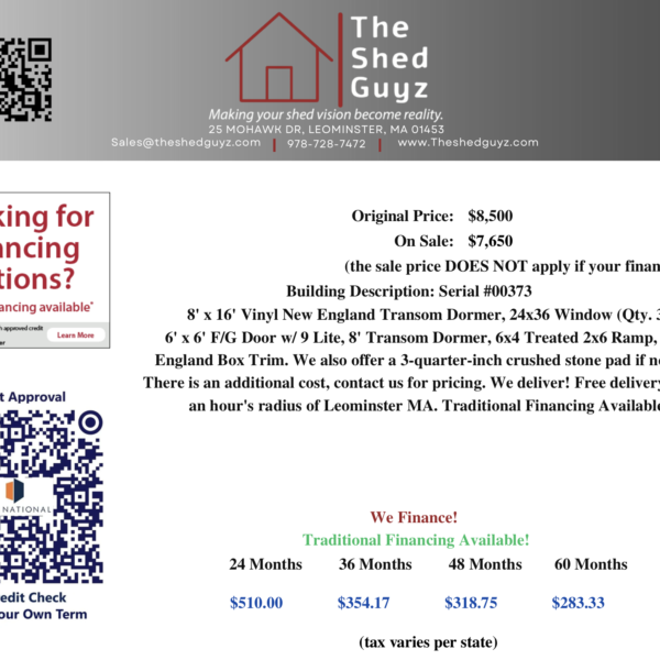 8' x 16' Vinyl New England Transom Dormer Serial# 00373